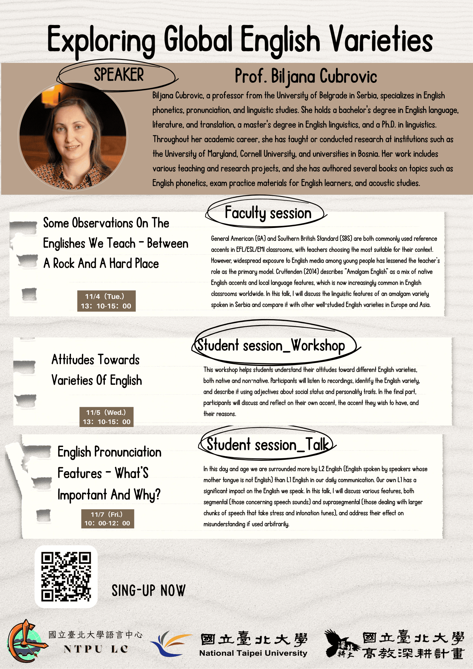 國際種子計畫11月場講者為來自 塞爾維亞 University of Belgrade 的英語系教授, Biljana Cubrovic 。她專注於英語語音學、英語發音及語言學研究。她擁有英語語言、文學及翻譯的學士學位,英語語言學碩士學位及語言學博士學位。此外,她曾在波斯尼亞、馬里蘭大學及康奈爾大學擔任教職或訪問學者,並參與多項研究及教學工作。她出版了多本書籍,涵蓋英語語音學、英語考試練習及聲學研究等主題。她的課程設計注重實用性與創新性,適合學生和教師參加。