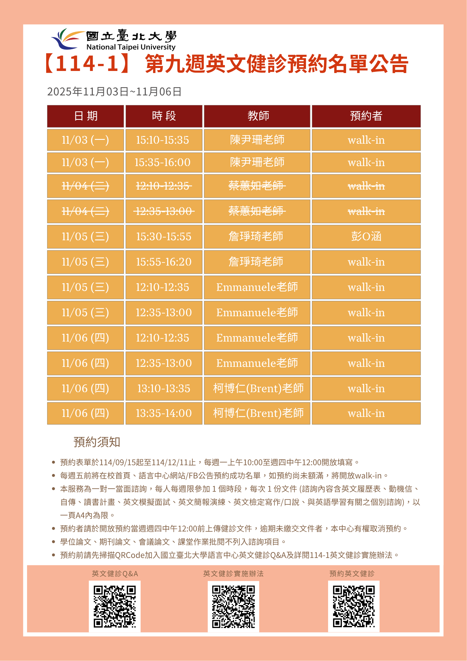 【語言中心】114-1 第九週英文健診預約名單公告,無人預約的時段當日提供walk-in。
