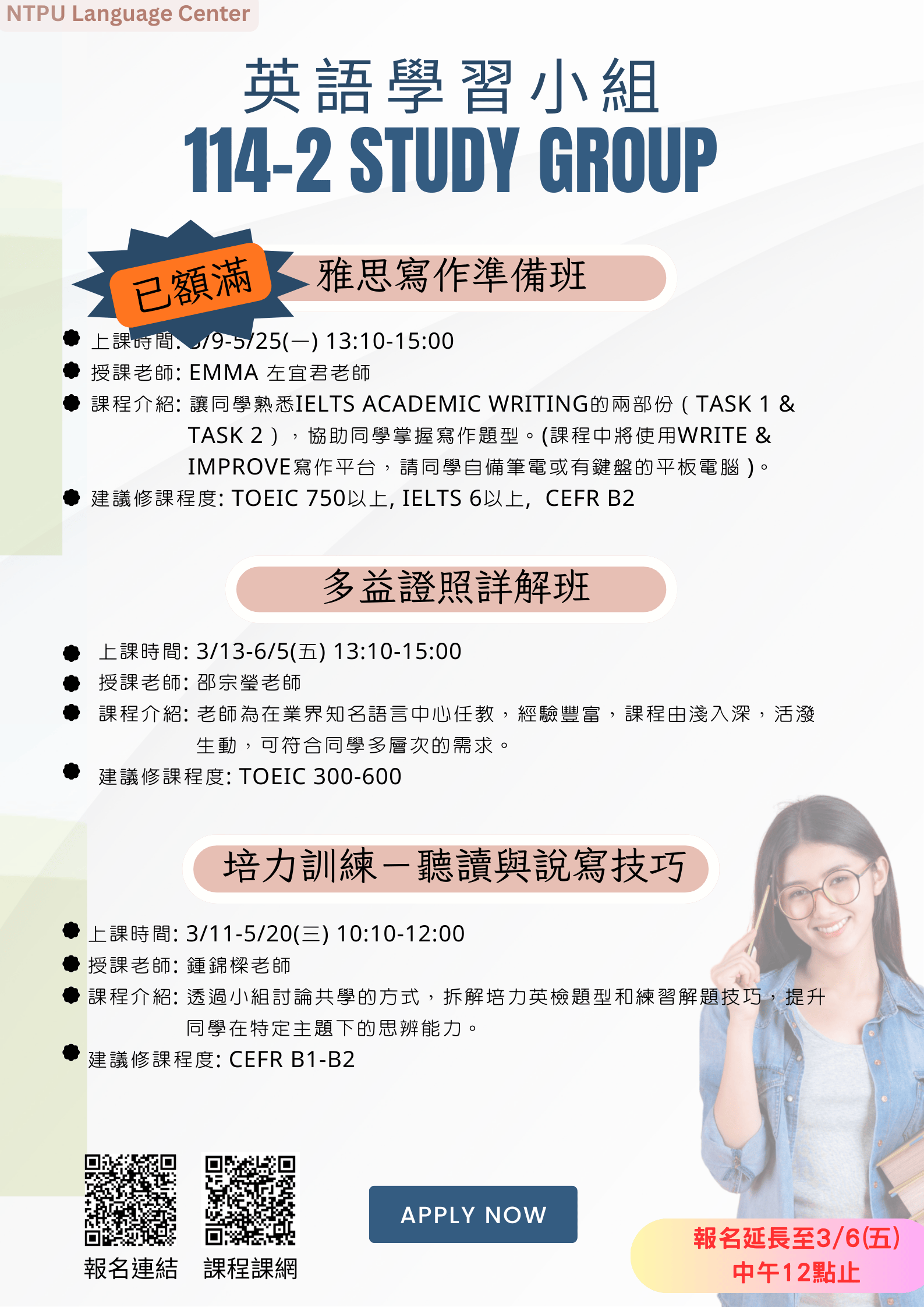 【語言中心】114-1 第十四週英文健診預約名單公告,無人預約的時段當日提供walk-in。