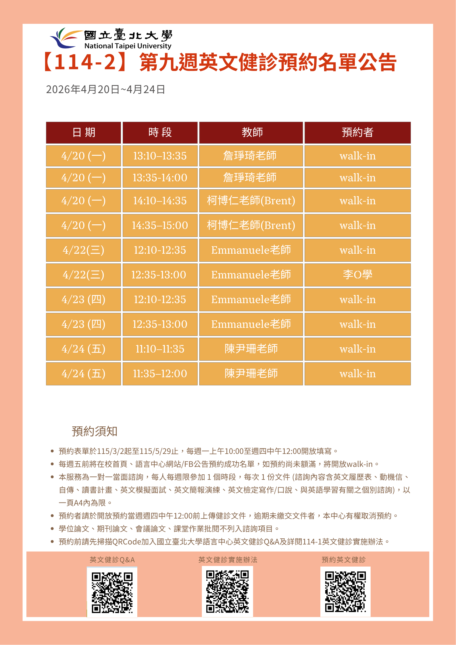 每週五前將在校首頁、語言中心網站/FB公告預約成功名單,如預約尚未額滿,將開放walk-in。