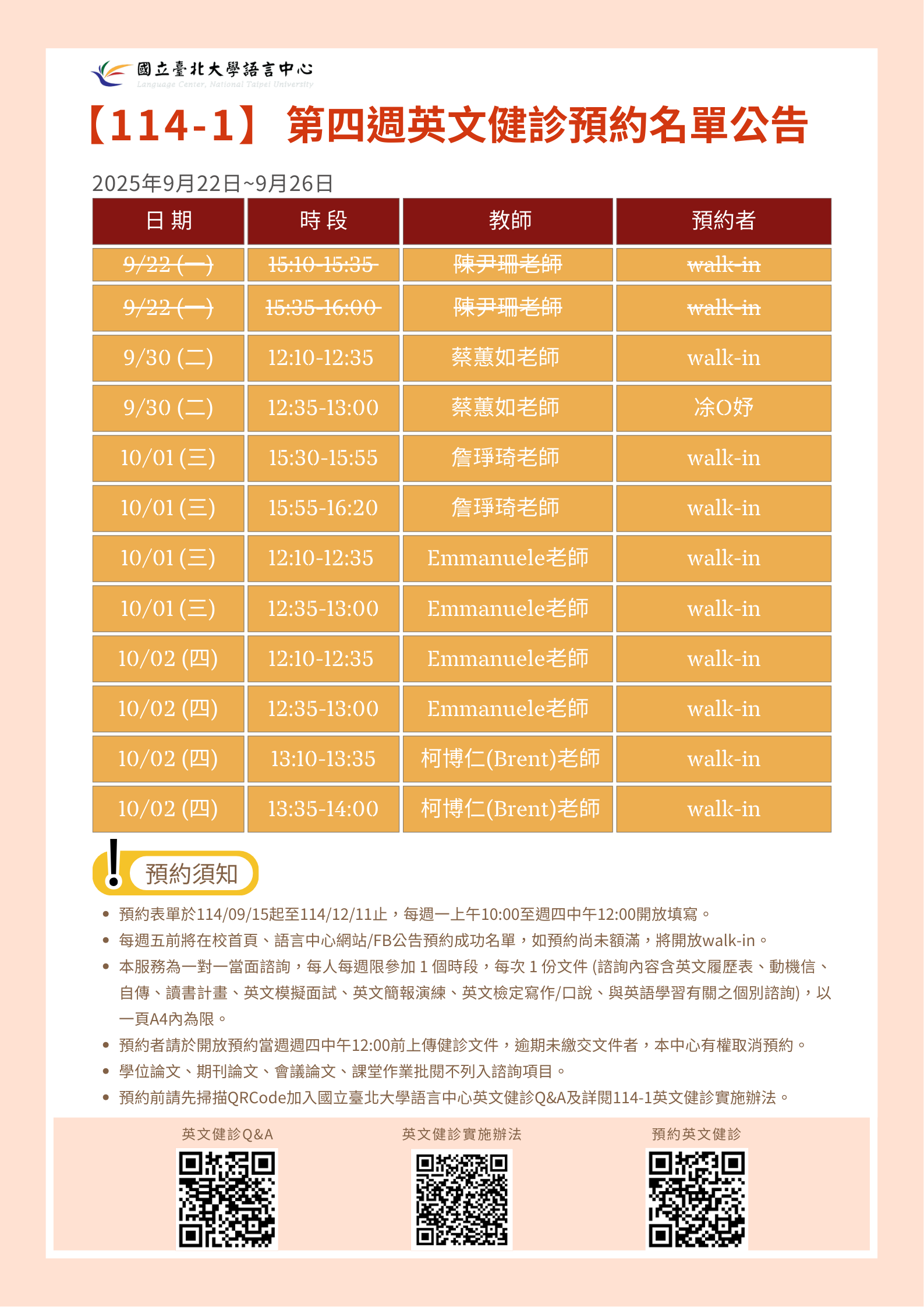 每週五前將在校首頁、語言中心網站/FB公告預約成功名單,如預約尚未額滿,將開放walk-in。