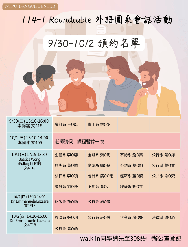 114-1 Roundtable 外語圓桌活動 預約公告(10/14, 10/15, 10/16)